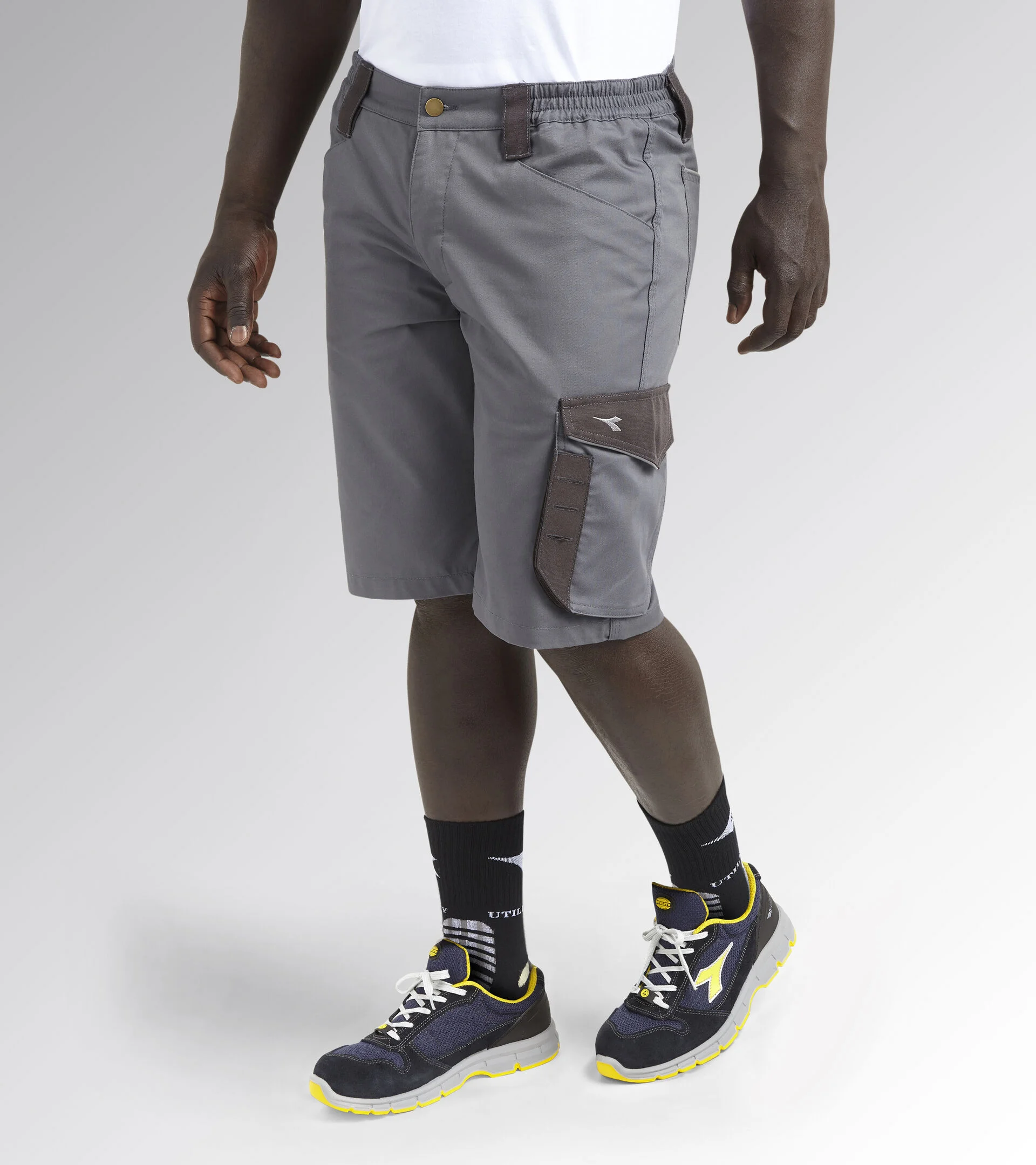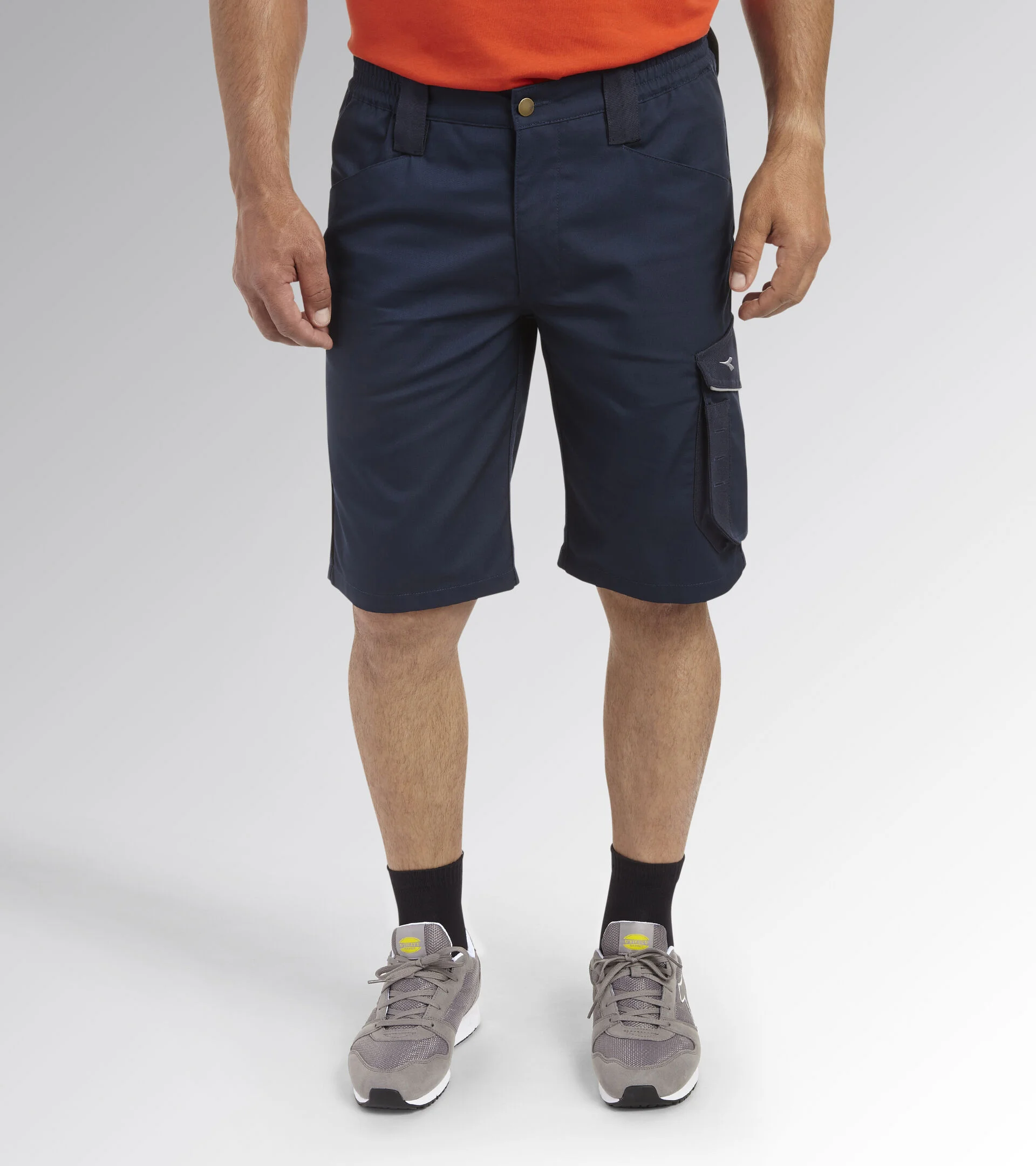 Bermuda avec poches latérales, détails réfléchissants, poche porte-mètre, porte-marteau. Les détails sont en toile polyester anti-abrasion. Taille élastique.