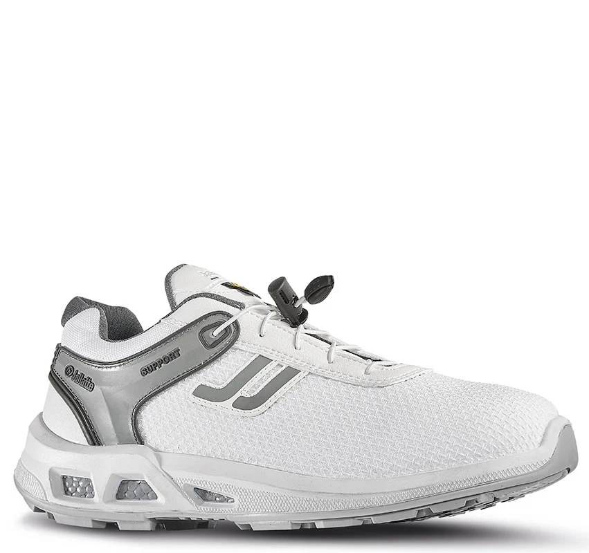 Basket de travail souple et légère, sans embout ni semelle anti-perforation conçue avec une technologie antifatigue. Tige et semelle assemblées en France. Coloris blanc et gris. Chaussures électrostatiques dissipatrices ESD de classe environnementale II testées suivant la norme EN 61340-4-3