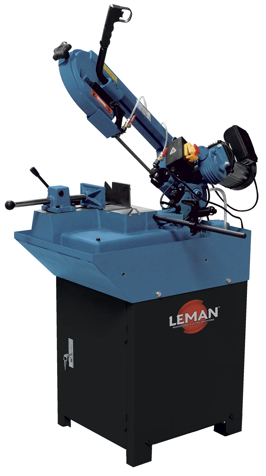 Bâti et archet de scie en fonte grise massive. Orientation de l’archet de 0° à 60° à gauche pour les coupes à l’équerre. Interrupteur IP54 basse tension avec arrêt d’urgence (coup de poing). Marche par appui sur gâchette. Guide lame par roulements. Étau à serrage rapide. Descente manuelle de l’archet avec ressort de rappel. Tension de lame réglable par volant. Dispositif de lubrification par 2 points en électro-pompe.