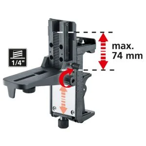 La fixation murale et support de serrage magnétique solide est compatible avec tous les appareils de mesure laser à filetage de 1/4 pouce. Elle est dotée d'œillets pour une fixation directe sur les murs. Les puissants aimants situés au dos garantissent une bonne fixation sur les surfaces métalliques. La pince de serrage permet une fixation horizontale et une fixation verticale sur les profilés de construction à sec. Le réglage de la vis de réglage permet de régler la largeur d’ouverture de la pince de serrage.