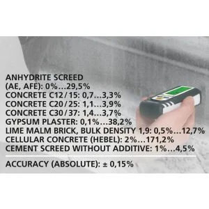 Le DampMaster Compact Plus est parfait pour déterminer rapidement l’humidité. L’instrument de mesure fournit des informations sur le degré d’humidité et de séchage du matériau. Les mesures spécifiques du matériau permettent d’atteindre une grande précision de la mesure. Toutes les informations importantes s’affichent en même temps sur l’écran bien structuré. L’interface Digital Connection permet de transférer facilement les données de mesure.