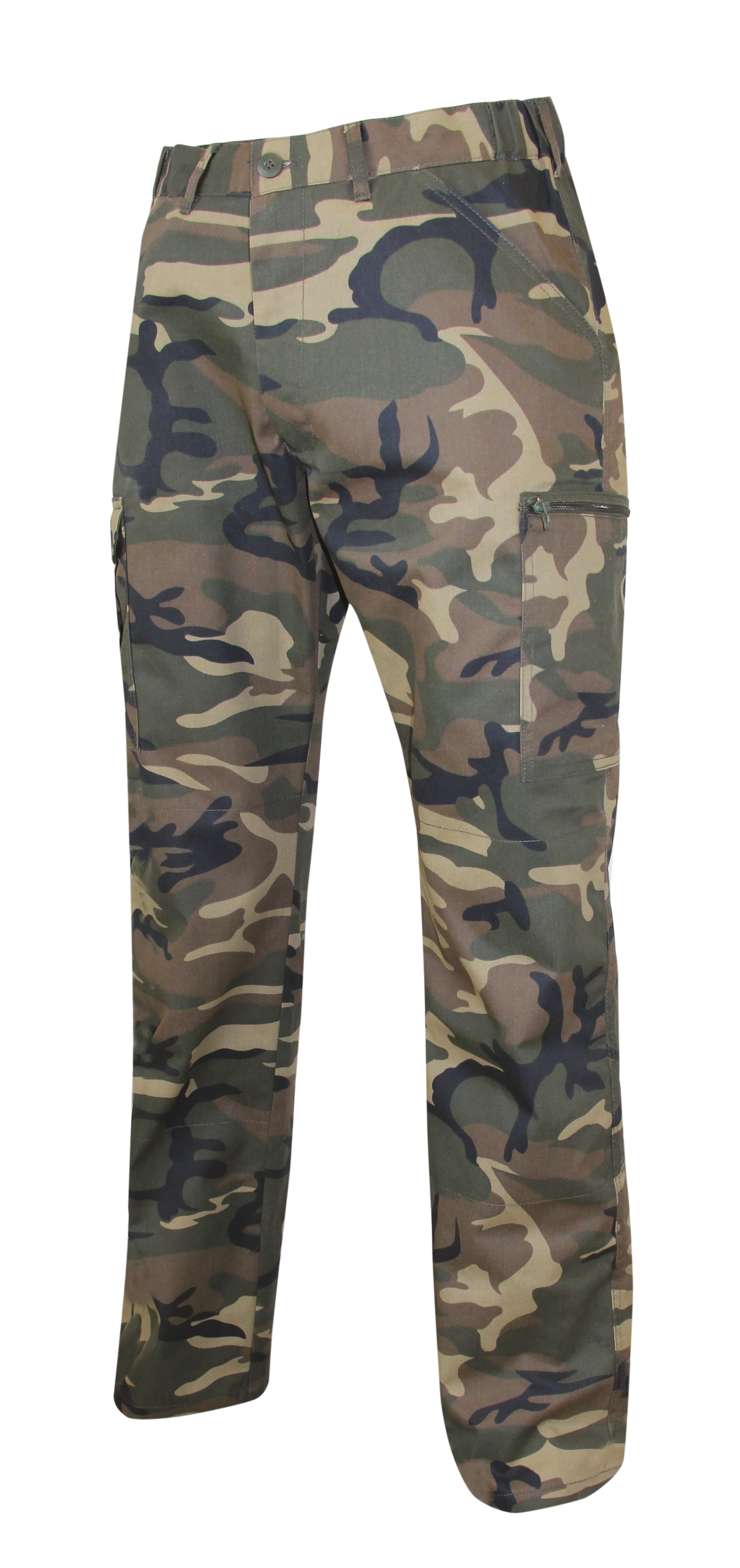 Ceinture élastiquée côtés - braguette zip spirale - 2 poches italiennes - 1 poche cuisse droite à rabat auto-agrippant avec ouverture porte mètre - 1 poche cuisse gauche zippée - 1 poche dos à rabat auto-agrippant. 65% polyester 35% coton
