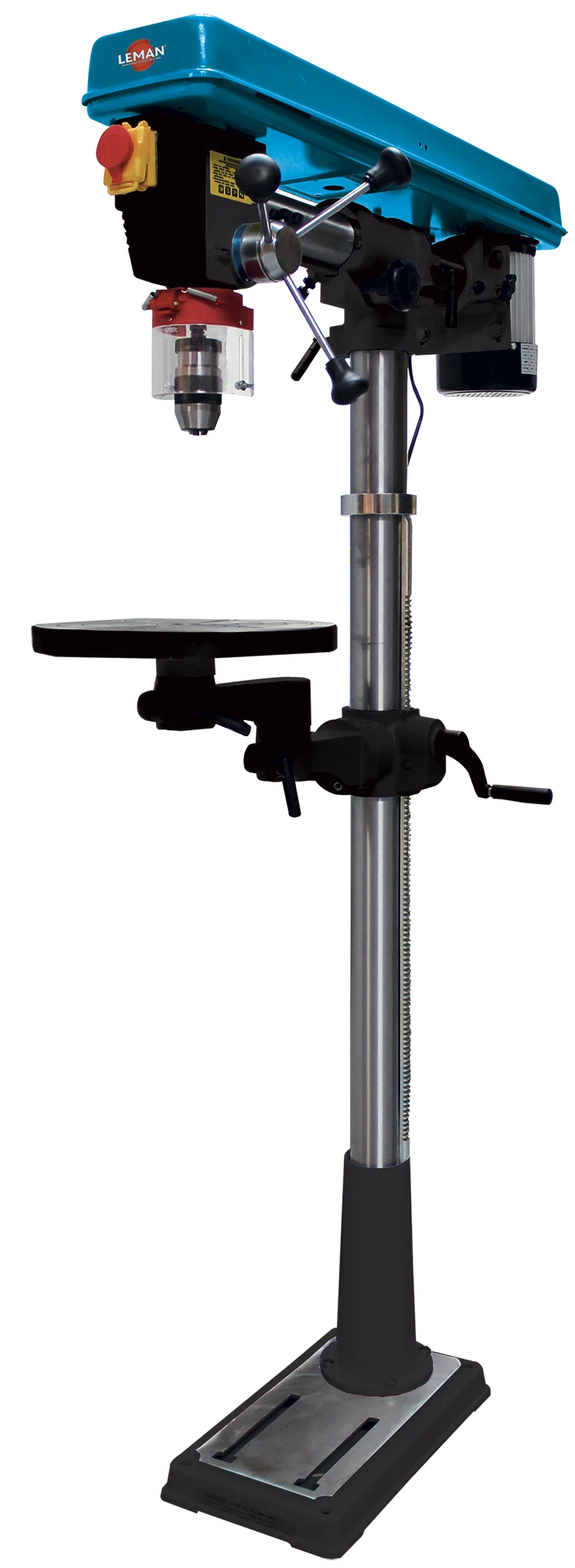 Précision de rotation garantie < 0,03 mm mesurée sur l’axe de perçage. Moteur aluminium. Axe équipé de roulements à billes. Montée et descente de la table par crémaillère. Coulissement de la tête par crémaillère jusqu'à 420 mm. Table tournante et inclinable à 45° et orientable à 360°. Socle robuste avec rainure en « T » et renforts arrières. Mandrin auto-serrant B16 livré de série. Butée de profondeur réglable.
