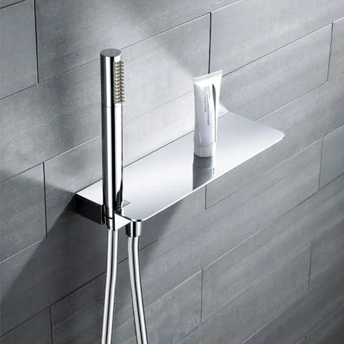Tablette 300 x 100 mm en laiton. Alimentation M 1/2″. Douchette tube Cox anticalcaire? 1 jet en laiton Flexible Silverflex 1,50 m anti torsion.